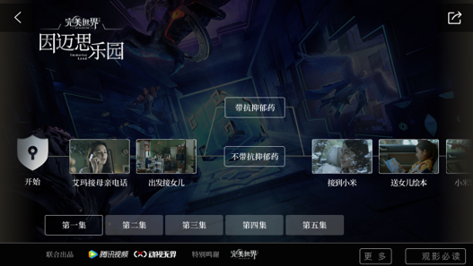 《因迈思乐园》共5集,每集7-10分钟的短剧形式,观众体验所有的剧情,大约需时1小时,共有27+个互动点。在互动设计中,增添了“全屏互动”的功能,减低了观众交互难度,提高观众互动操作的便捷性,有效引导观众进入“互动观影”状态。